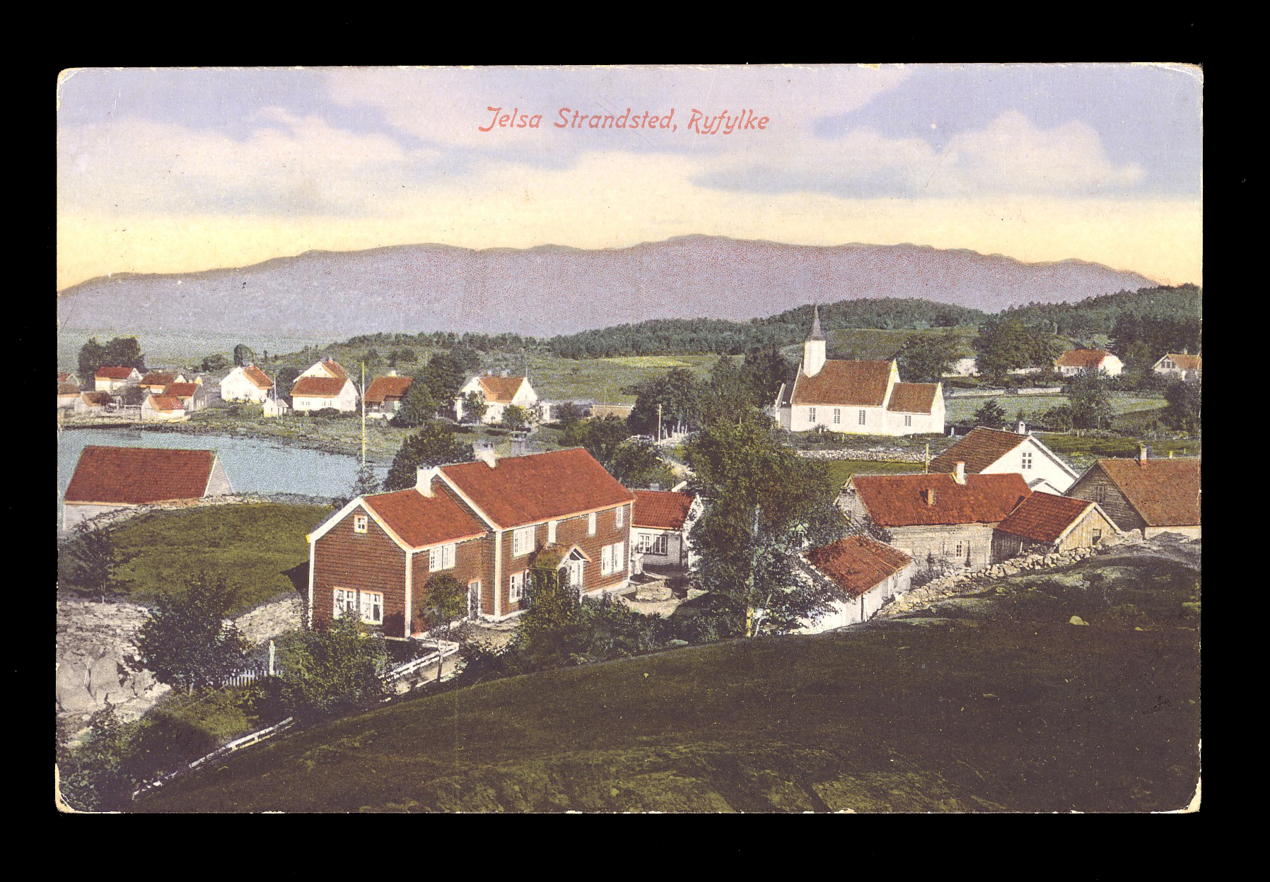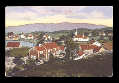 kolorert kort, kjent brukt fra 1918. Vi ser kirken like til høyre for midten